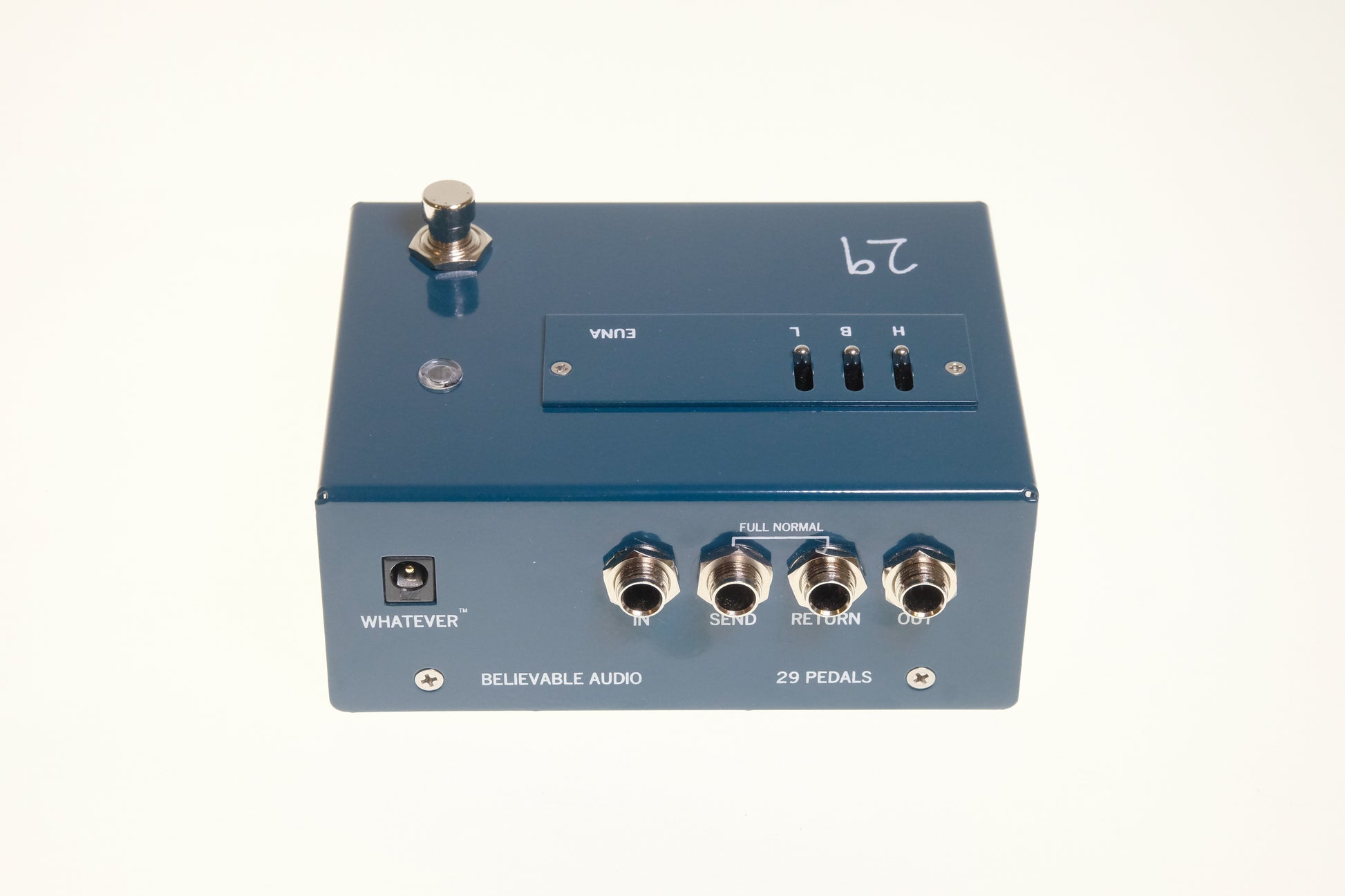 EUNA features 29 Pedals’ WHATEVER power supply. The WHATEVER power supply accepts 7.5 to 35 volts of AC or DC (either polarity) with absolutely no change in tone. It’s true!!