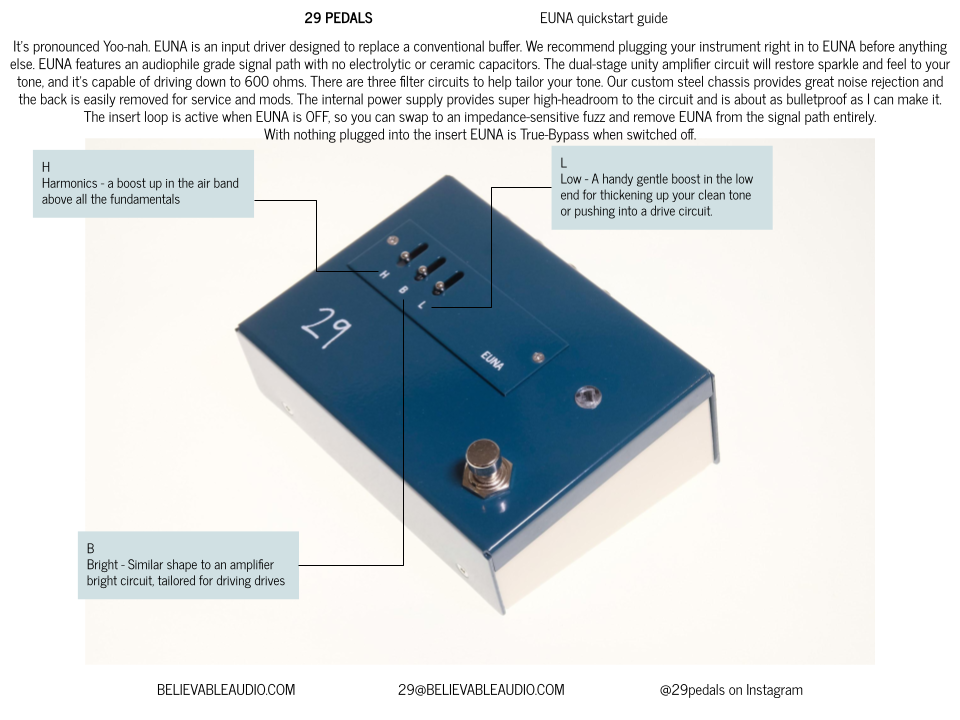 An input driver that replaces a conventional buffer, EUNA is built to protect and condition your instrument's signal to prepare it for whatever you want to do with it. Console grade build, three great sounding filters, and an alt-path insert loop for your classic fuzz and wah circuits that don't want to be buffered. Also features the 29 Pedals WHATEVER power supply, which accepts 7.5 to 35 volts of AC or DC in either polarity with no change in tone. EUNA is made by 29 Pedals in California.