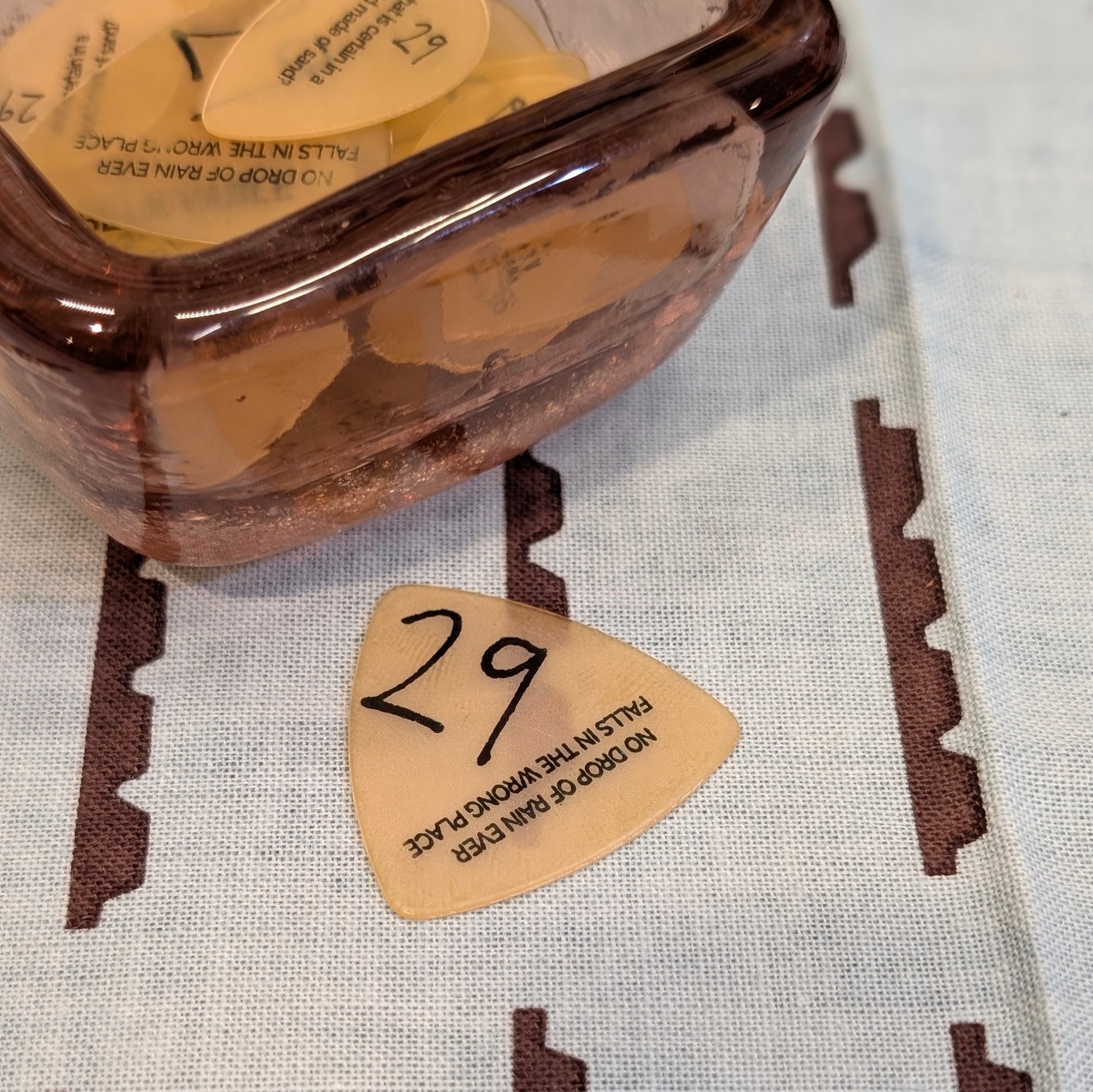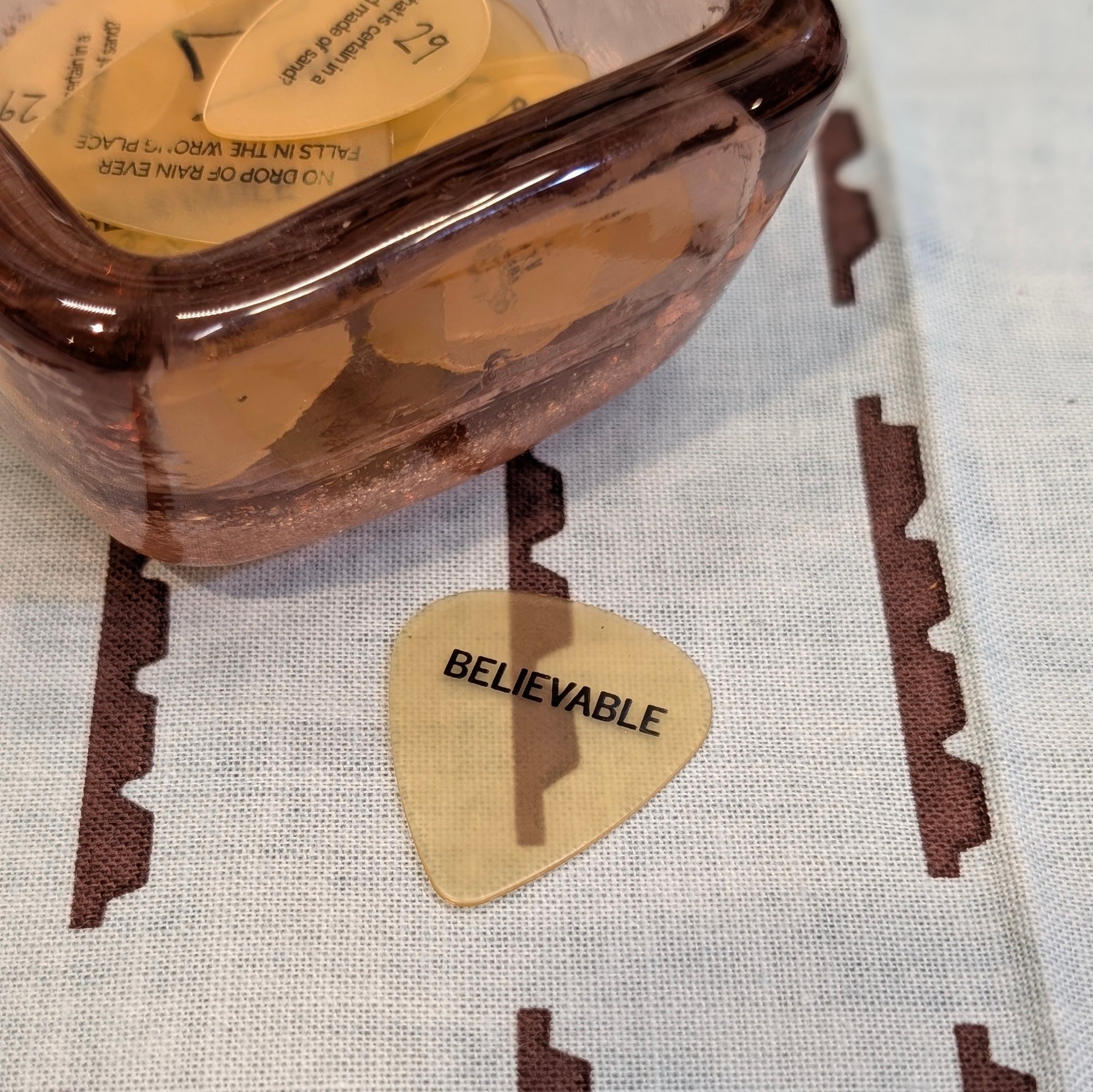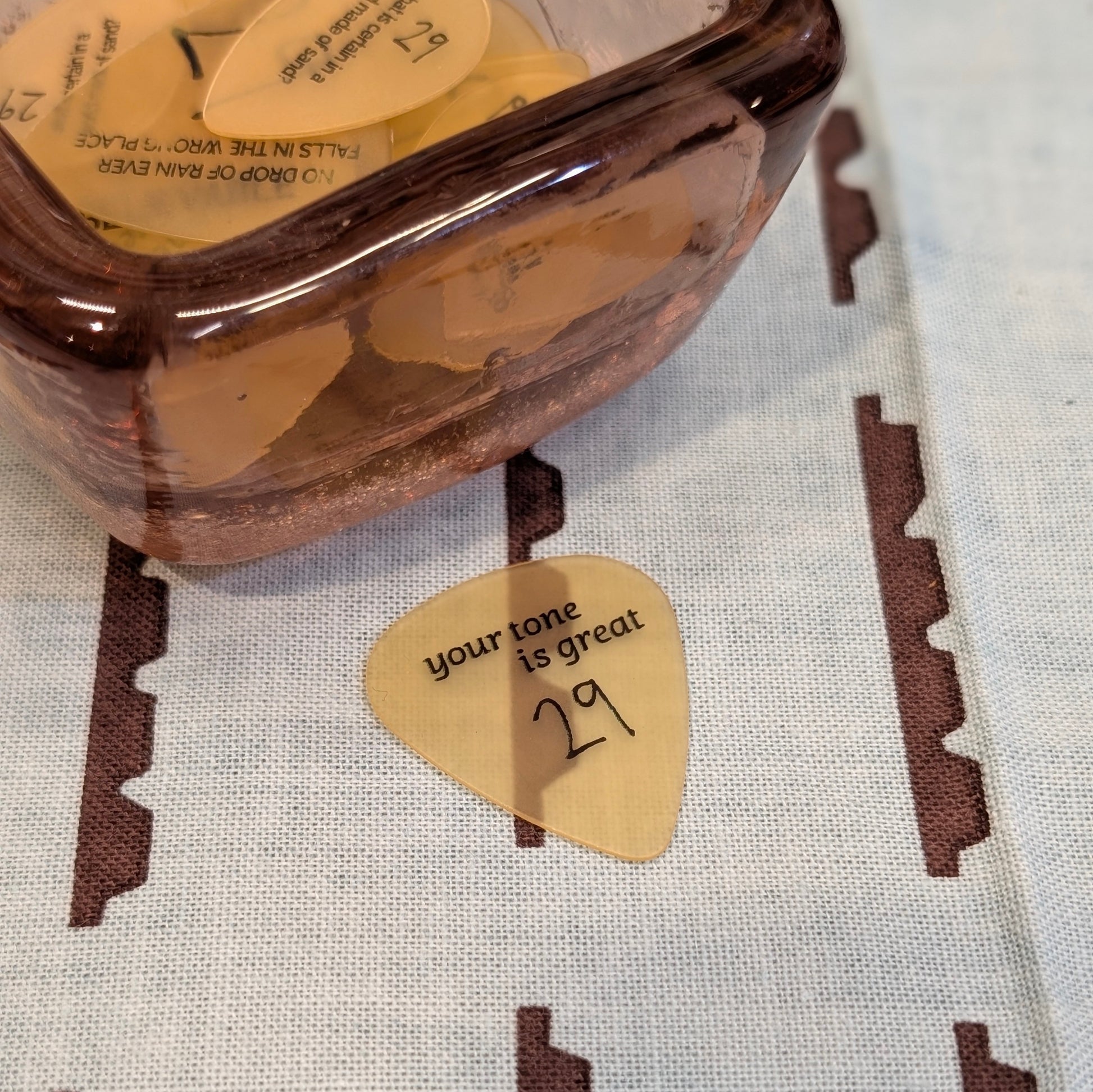 I took a long journey listening to different guitar picks to find ones I really liked. All kinds of materials, natural and manufactured, old and new, just a really strange amount of time listening to guitar picks. There are some esoteric materials and boutique makers that are simply amazing, but I also needed everyday picks. After this long journey, it turns out I really like the sound of Ultex for some things, and Delrin for others, so I had some of each made up and here they are. The Ultex is great on picking, arpeggios, leads etc. Delrin is great on strumming, heavy playing, and bass. We stock a few varieties few you to choose from.